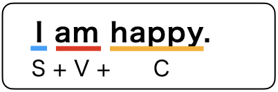 「I = happy(私は幸せ)」のように、主語を説明する言葉が C:補語です。